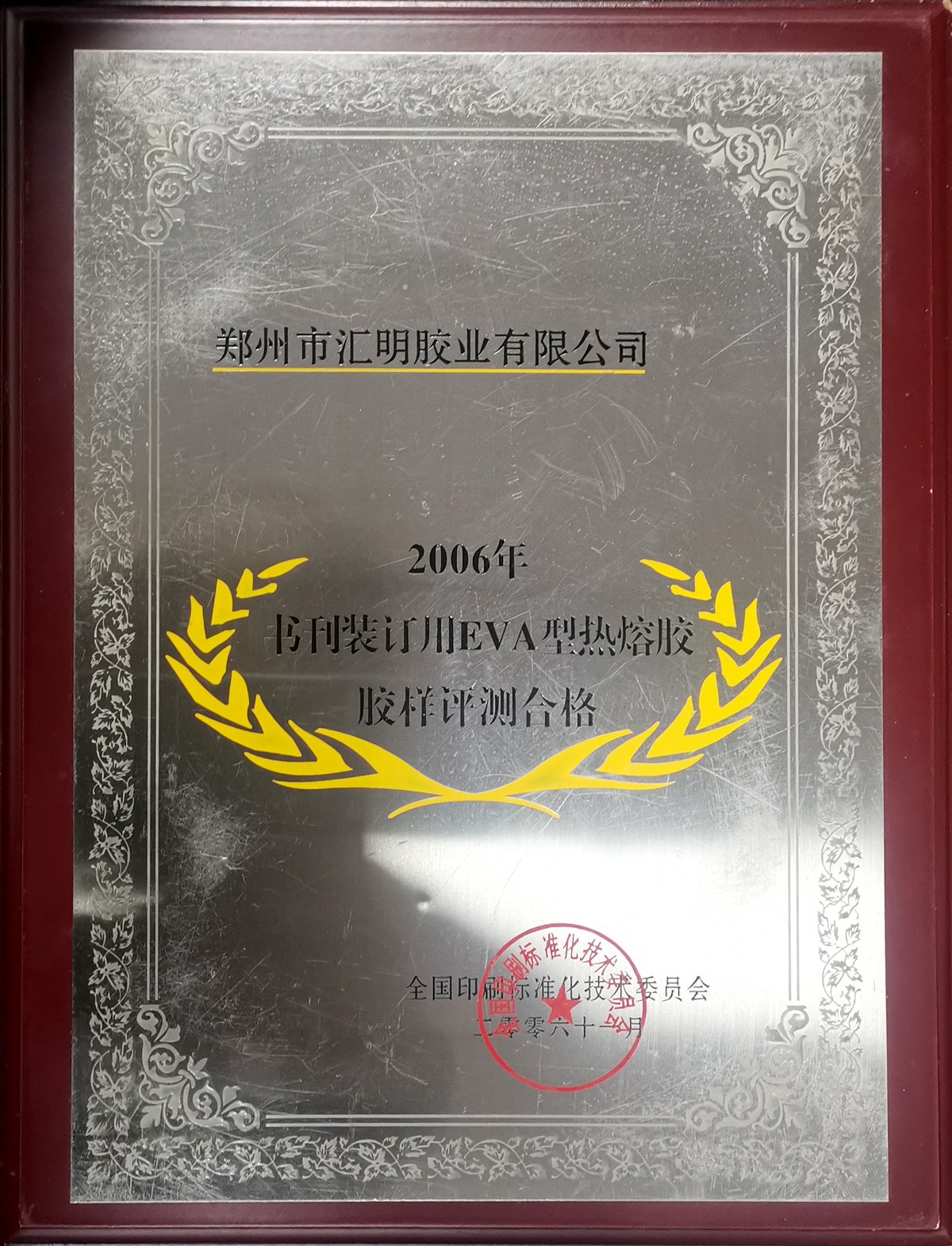書刊裝訂用EVA型熱熔膠膠樣評(píng)測合格證書
